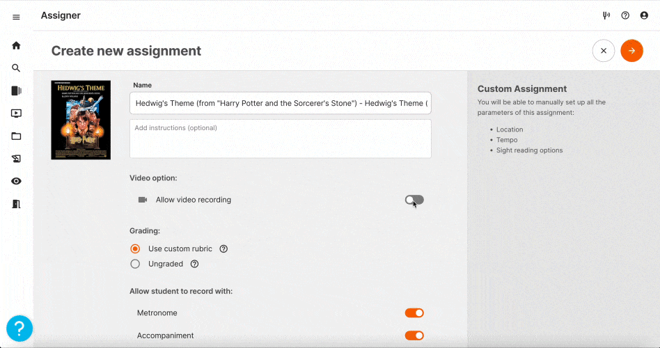 - Assign the music as an Ungraded assigment, skipping the rubric page and assigning it quickly.